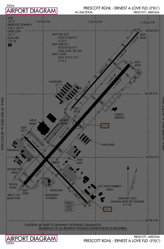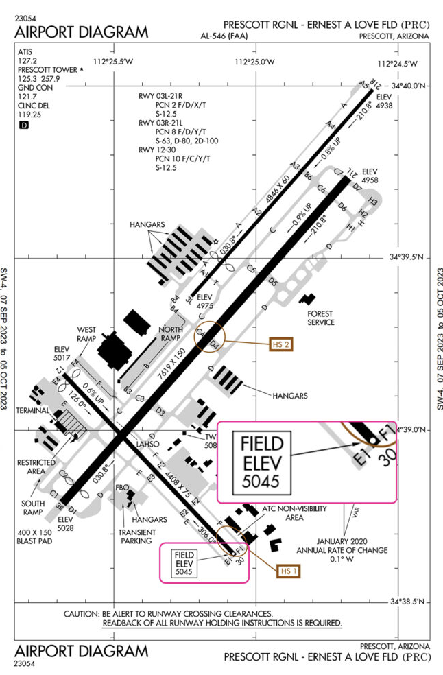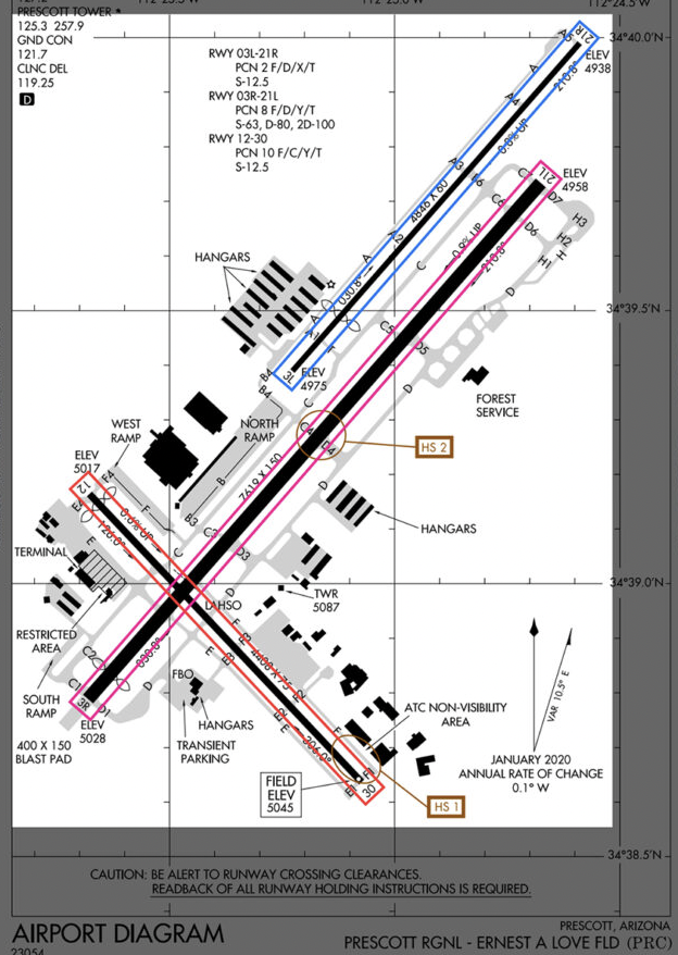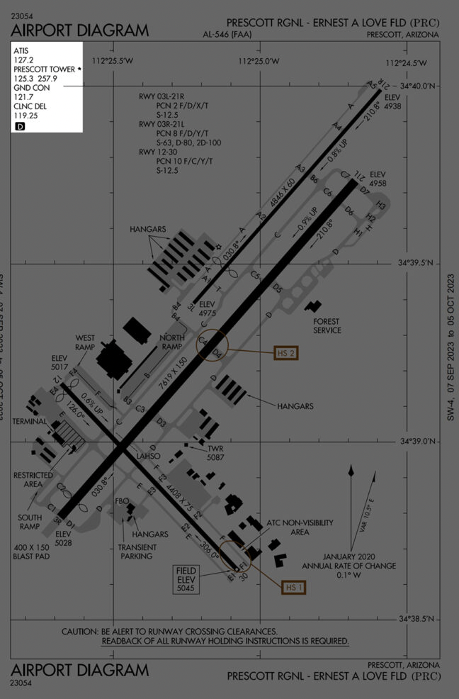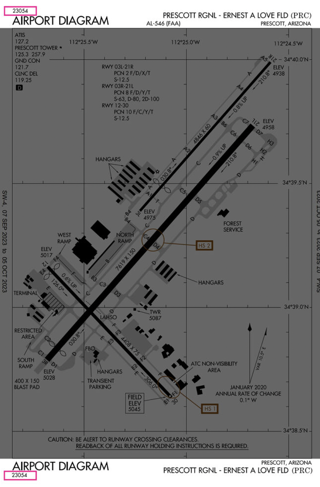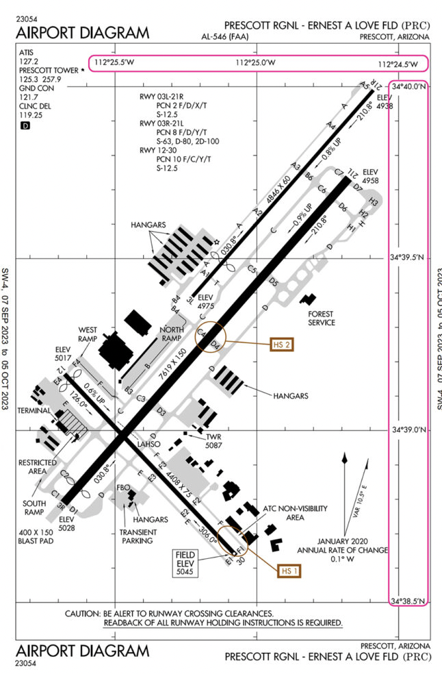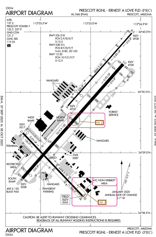 At Prescott Regional, there are two hotspots, one on Runway 12/30, and the other on Runway 3R/21L. They are marked with the brown circles and labeled HS 1 and HS 2.