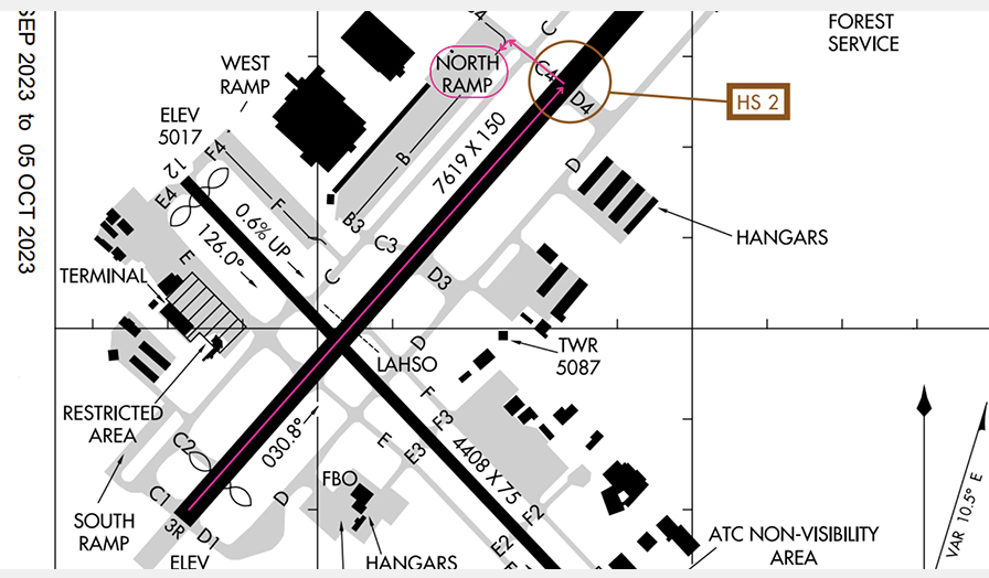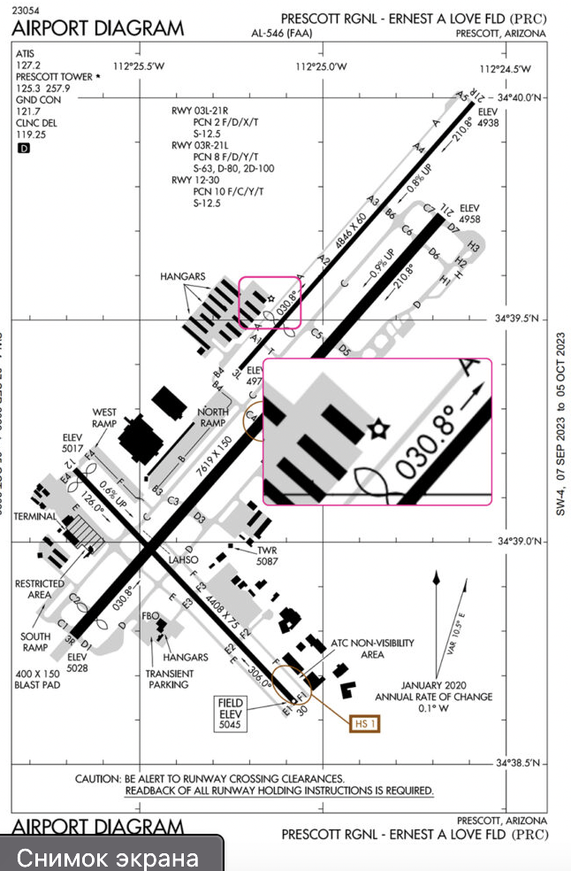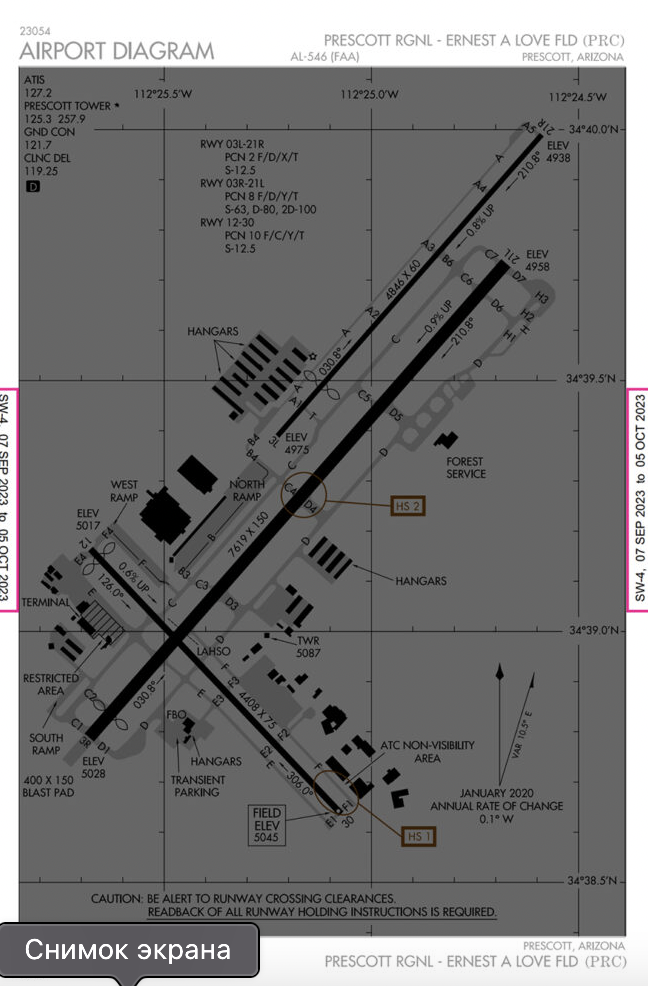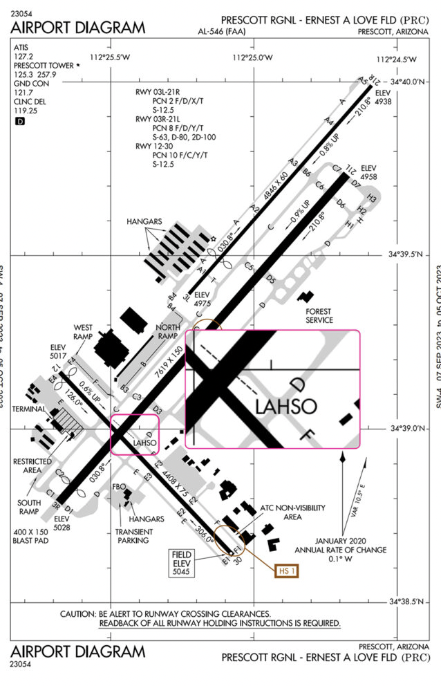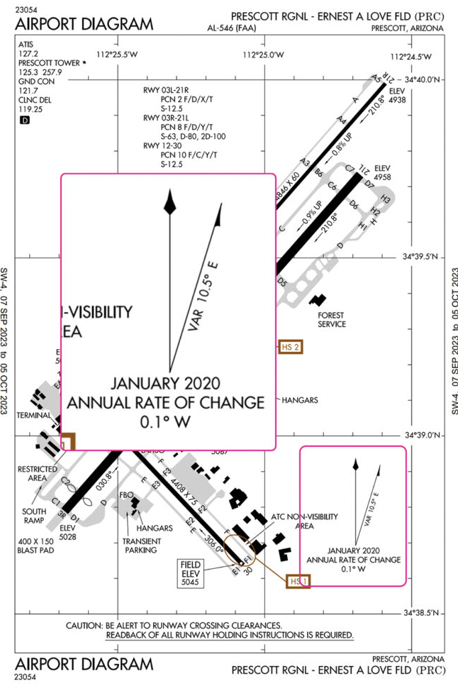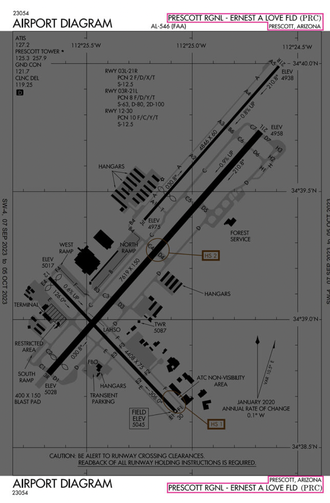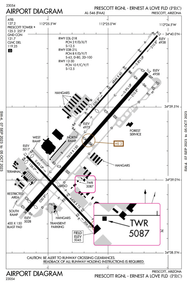 At Prescott Regional, there are two hotspots, one on Runway 12/30, and the other on Runway 3R/21L. They are marked with the brown circles and labeled HS 1 and HS 2.