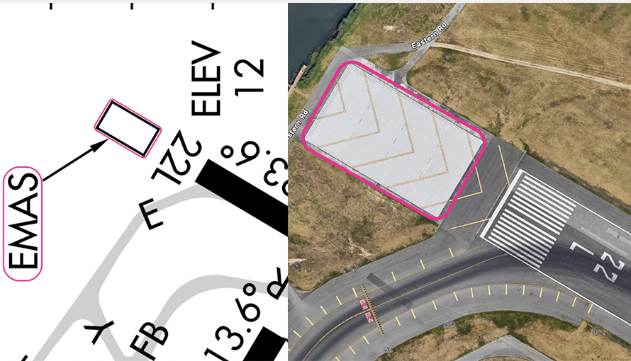 EMAS is depicted as white rectangles with black borders at the end of the runway and is labeled EMAS.